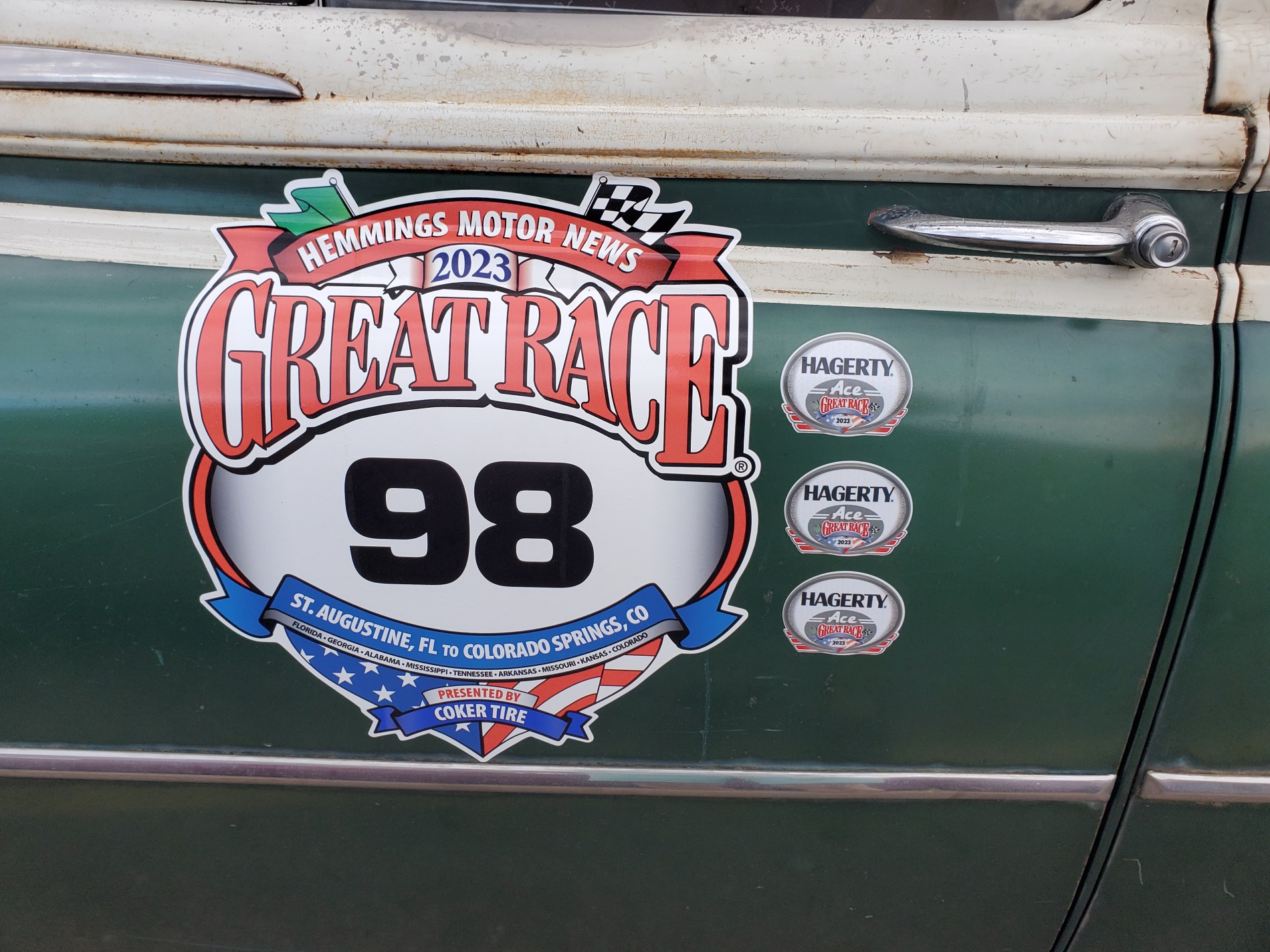 We started the morning receiving 1 1/2 pages of race instruction changes. That is a lot of changes, and they just added confusion. We left immediately upon receipt of our day’s instructions, and started our calibration run. We had about a 25-minute run and ended up adjusting the speedometer by one click – from 4-3-3-2 to 4-3-3-3. From there we headed off to the start of the race. The first leg was uneventful, and we scored a 6. The second leg was sneaky. We were traveling down a two-lane road, one lane with traffic in each direction. We were readying for a left-hand turn when another Great Race vehicle, a black Ford pick-up, came towards us and made the same turn prior to our reaching the intersection. Our first reaction was this driver must have missed the turn when traveling in our direction, then turned around some distance down the road, traveling back to make the missed turn. Now they were in front of us, and we both passed a checkpoint. Our next instruction was to turn right on a named road. We were traveling at 45mph and felt relieved that we would benefit from this driver in front of us, because we would see him make the turn, and we would know the exact location of the road. Traveling fast with turn instructions can be tricky, because one must slow down to read the names on the signs, otherwise you miss them altogether. Every time one slows from the proscribed speed they need to make up that lost time. We saw an approaching right turn but did not give it much thought, because the car in front blew past it. As luck would have it, it was our street, and Hal yelled, “This is our turn!” I slammed on the brakes, pushed in the clutch, downshifted to 2nd gear, yanked the steering wheel hard to the right, then popped the clutch and hit the accelerator. The back end of The Hippo swerved hard, with Hal leaning over onto me as we swung around. We miraculously pulled out the turn. As we surged forward, I started thinking about the car in front of us. I knew the 4 cars that were supposed to be in front, and the black Ford was not one of them. Hal checked the list, and that Ford was 10 or 12 cars ahead. I asked Hal if we had three more right hand turns as our next three instructions, and he confirmed. The race designer had everyone going around the block, but instead of being a city block, each side of the block was several miles long. As we made the turn onto the road where we first saw the black Ford, we started strategizing how to make up the needed time from our last turns, because we knew we were going to pass the checkpoint again very soon. As we were noodling through that, I asked Hal, “By the way, what’s our next instruction?” He said, “Increase speed to 50mph at the first 55mph sign.” While we were strategizing how to make up time, we stopped paying attention to the road, and flew past the 55mph sign, missing it altogether. Now we had to make up for the lost time on the turns AND an unknown amount of time. What to do? You know where this is going… Floor it! We made our last turn and tried to pick-up as much time as possible, but we also had to swiftly brake after passing the checkpoint for a second time, because we were now into our third leg, and we needed to be back at the new proscribed speed. The net effect – we scored a 10 second loss on the second leg. We were both happy with that outcome given the circumstance.